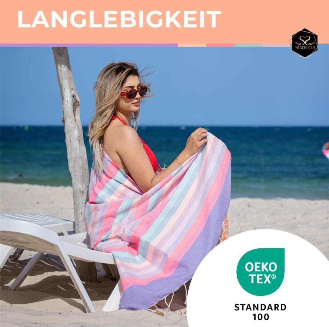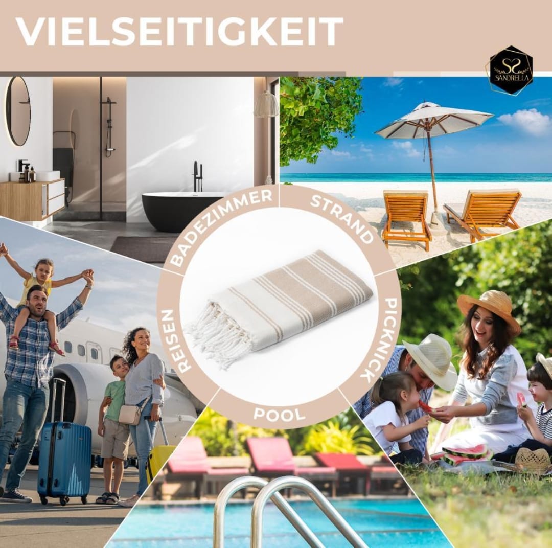 "Top Qualität, super leicht, wunderschönes Design und das zum besten Preis.Ich liebe die Hamamtücher von Sandrella, sie sind nicht nur ein stilvolles Accessoire für jeden Strandtag oder Thermenbesuch, sondern passen in jeden Koffer und sind ein idealer Reisebegleiter.“