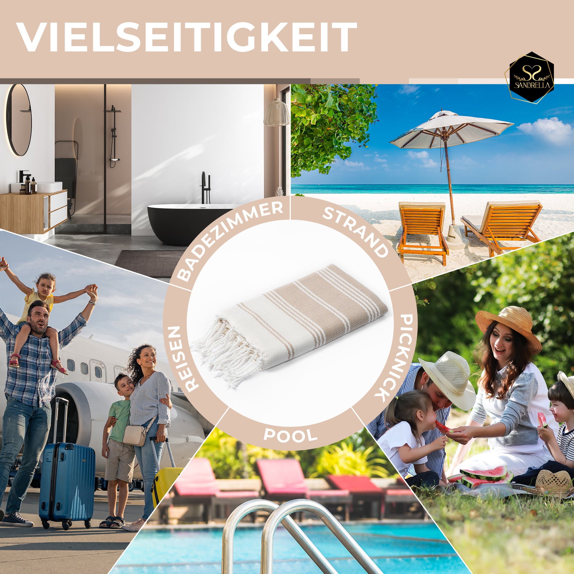 • „Hervorragende Qualität, extrem leicht und ein wunderschönes Design – und das zu einem unglaublich fairen Preis. Ich bin begeistert von den Hamamtüchern von Sandrella. Sie sind nicht nur ein elegantes Accessoire für Strandtage oder den Spa-Besuch, sondern lassen sich auch kompakt verstauen und sind der perfekte Begleiter auf jeder Reise.“