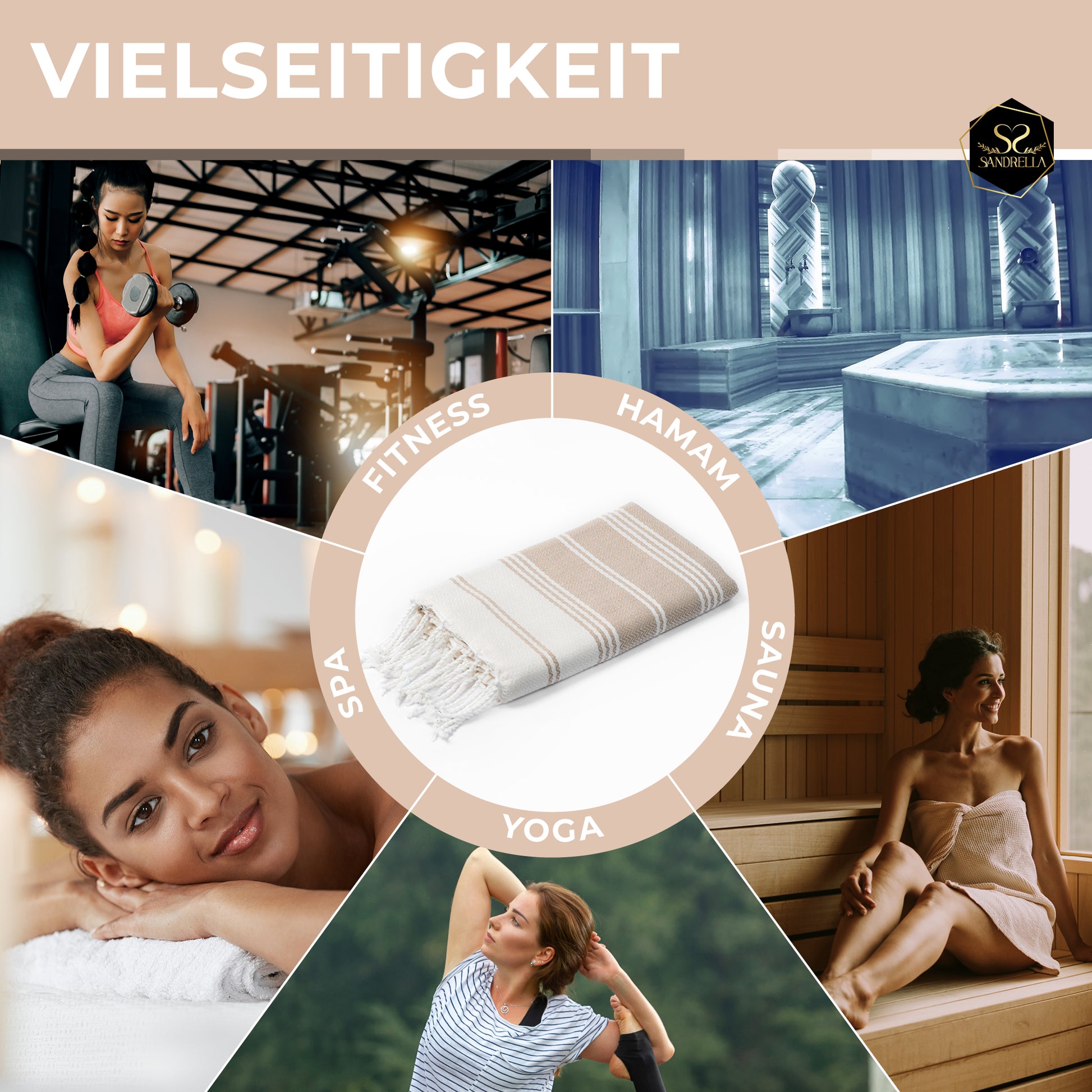 🏖️ VIELSEITIG - Unser Hamamtuch kannst du als Strandtuch, Duschtuch oder Yogatuch verwenden. Auch in der Sauna ist es der perfekte Begleiter. Durch die Vielseitigkeit sind unsere Hamamtücher ideal für Frauen oder Männer oder Paare die gerne in die Sauna, zum Strand oder Sport gehen.