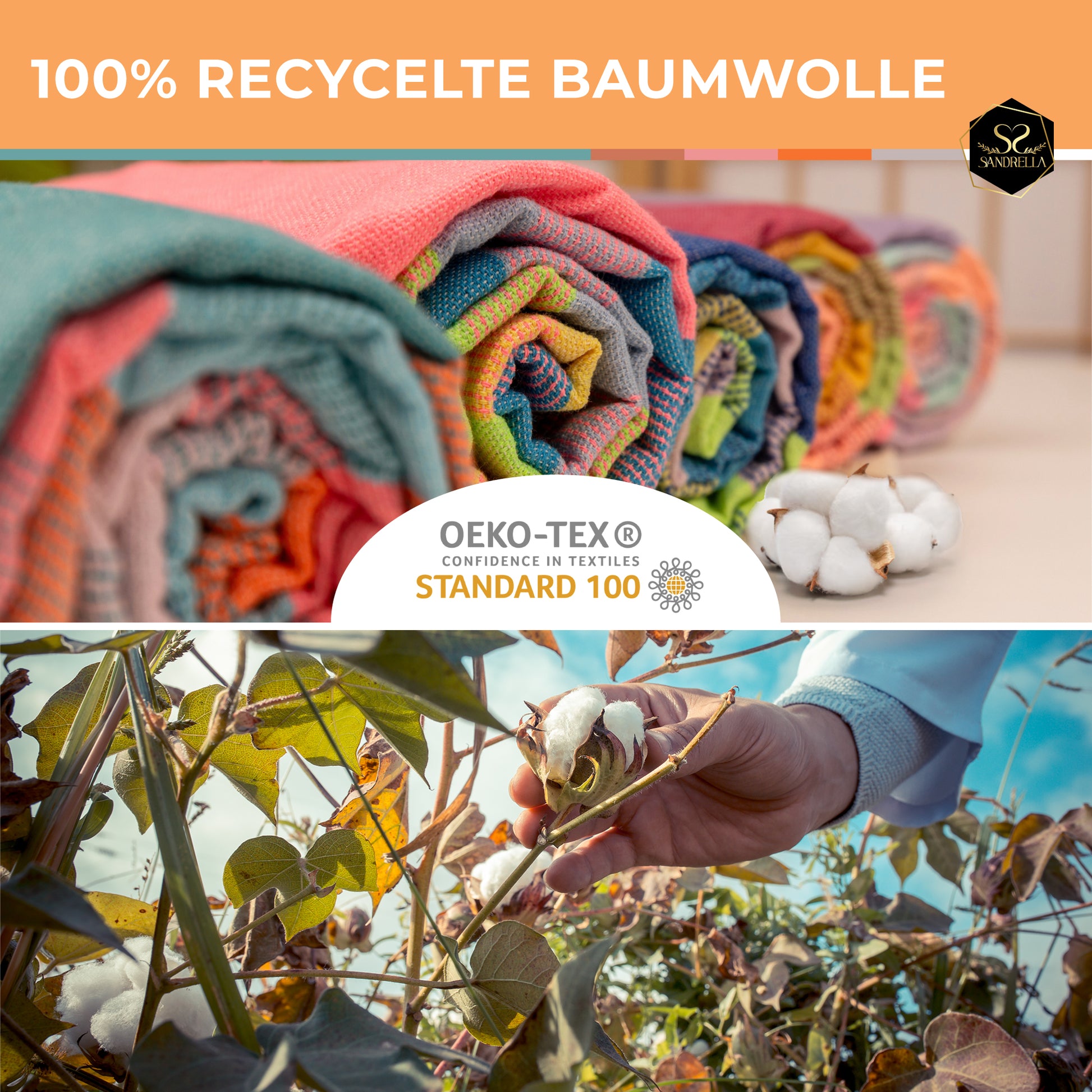 🧶 Das Hamamtuch wird zu 100% aus recycelter Baumwolle hergestellt. Wir achten auf eine sehr hochwertige Qualität der Fasern. Die Baumwollfasern schaffen ein weiches Tuch, welches sich angenehm auf deiner Haut anfühlt.