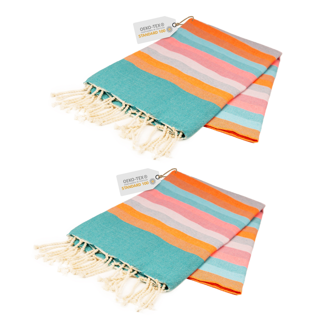 🧺 100 X 200 CM – Du genießt dein Leben im Park, am Pool oder im Sand. Das große Hamamtuch mit den Abmessungen 100 x 200 cm eignet sich zur Mitnahme. Im Rucksack ist es klein und leicht, ausgepackt ist es ein großes Badetuch oder eine Picknickdecke. Set - 2x 100x200cm