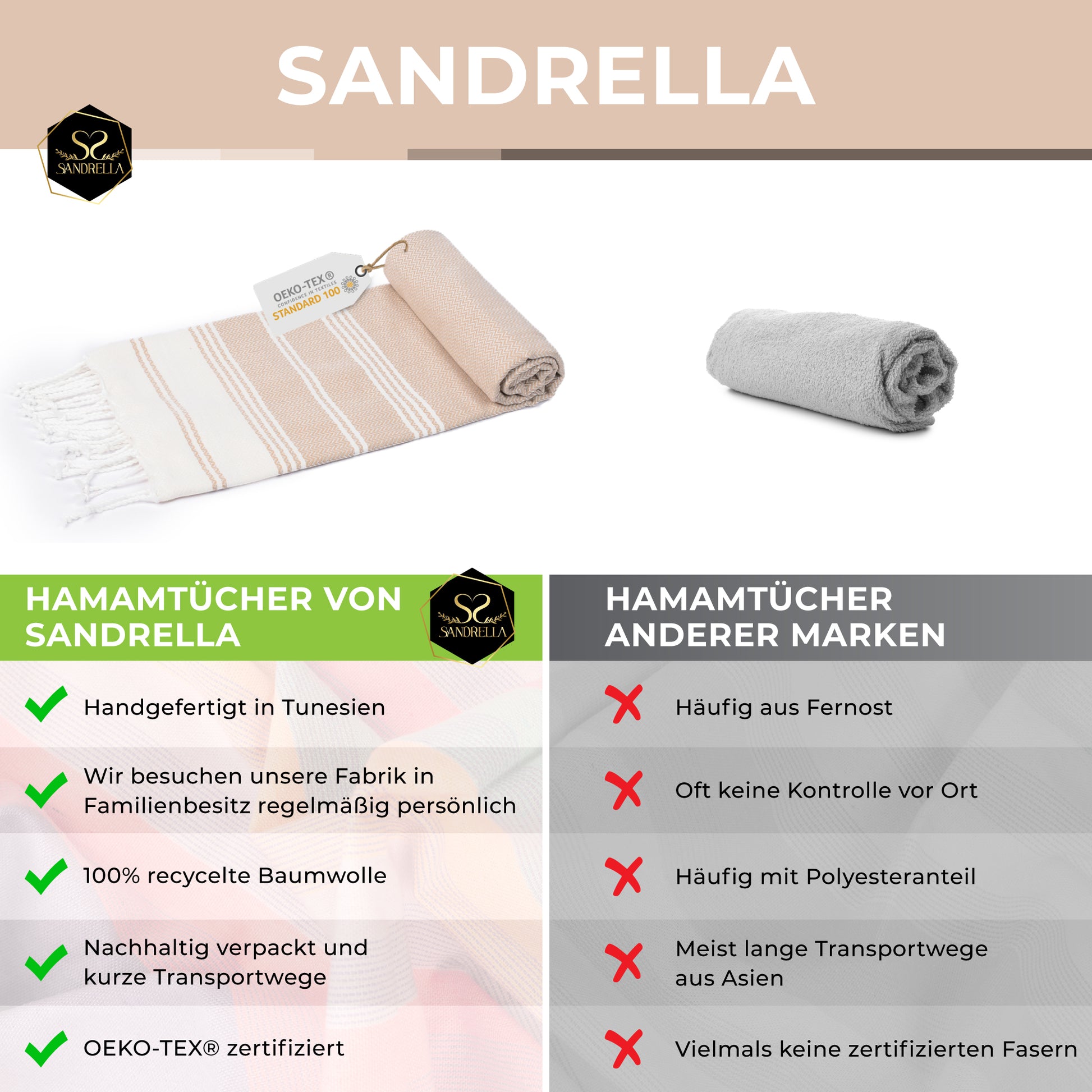 • „Hervorragende Qualität, extrem leicht und ein wunderschönes Design – und das zu einem unglaublich fairen Preis. Ich bin begeistert von den Hamamtüchern von Sandrella. Sie sind nicht nur ein elegantes Accessoire für Strandtage oder den Spa-Besuch, sondern lassen sich auch kompakt verstauen und sind der perfekte Begleiter auf jeder Reise.“
