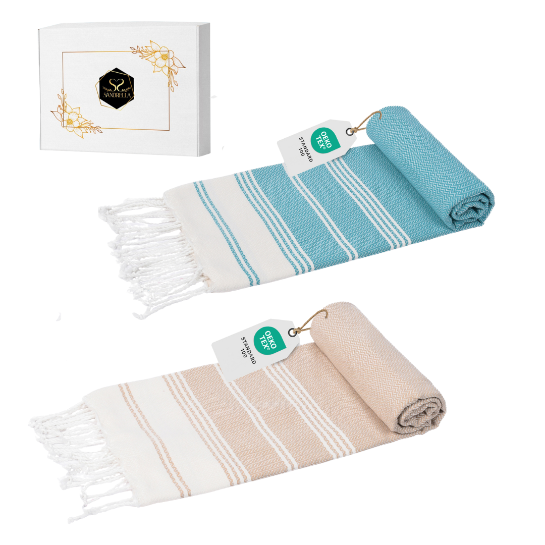 🧺 100 X 200 CM – Du genießt dein Leben im Park, am Pool oder im Sand. Das große Hamamtuch mit den Abmessungen 100 x 200 cm eignet sich zur Mitnahme. Im Rucksack ist es klein und leicht, ausgepackt ist es ein großes Badetuch oder eine Picknickdecke. Set - 2x 100x200cm