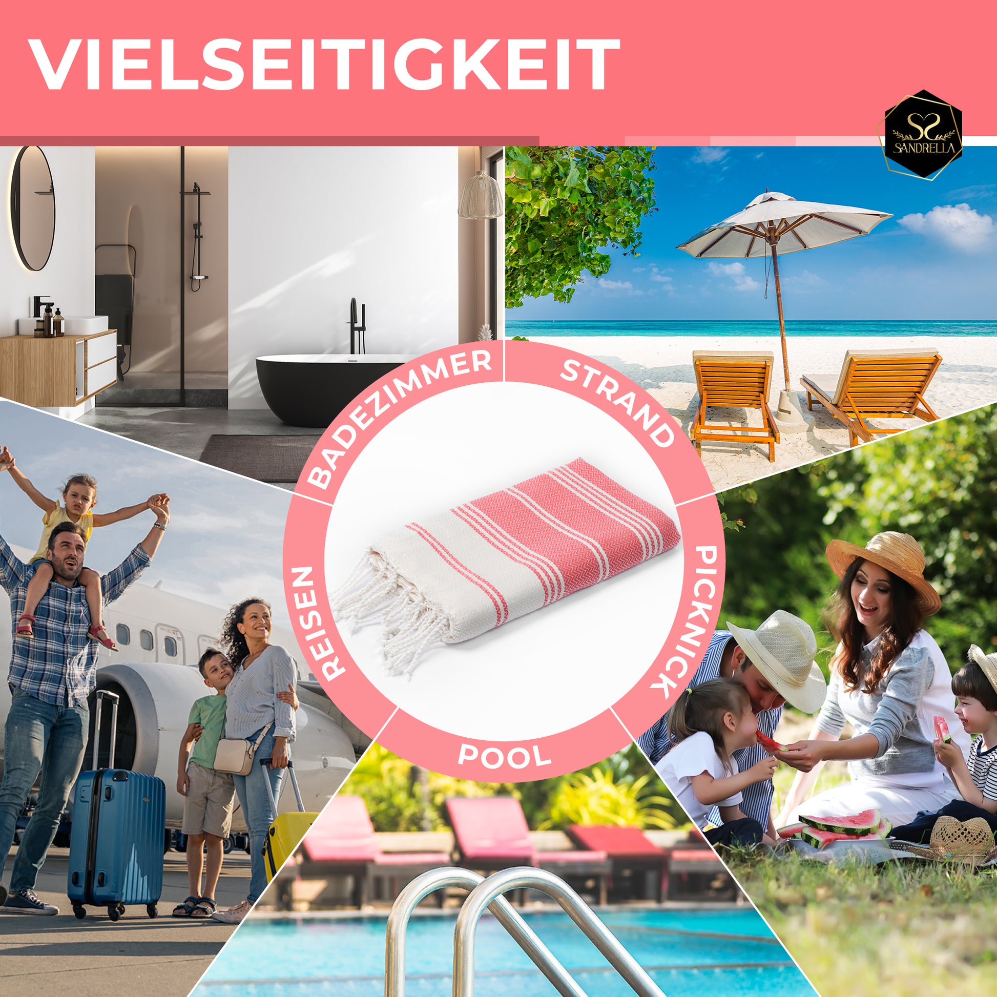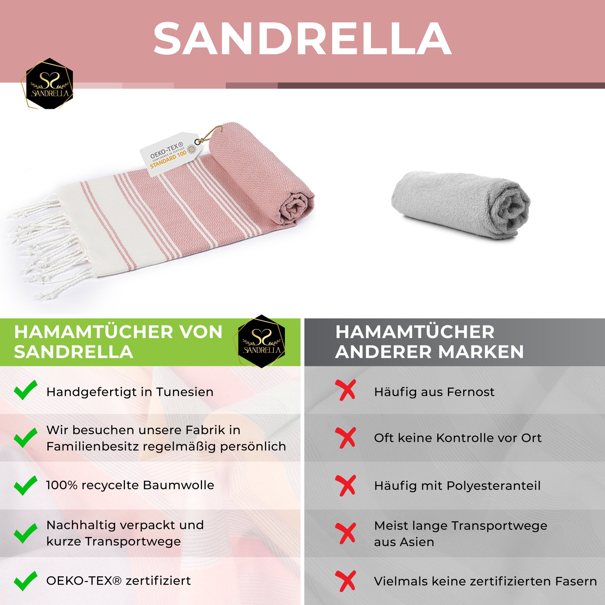• „Hervorragende Qualität, extrem leicht und ein wunderschönes Design – und das zu einem unglaublich fairen Preis. Ich bin begeistert von den Hamamtüchern von Sandrella. Sie sind nicht nur ein elegantes Accessoire für Strandtage oder den Spa-Besuch, sondern lassen sich auch kompakt verstauen und sind der perfekte Begleiter auf jeder Reise.“