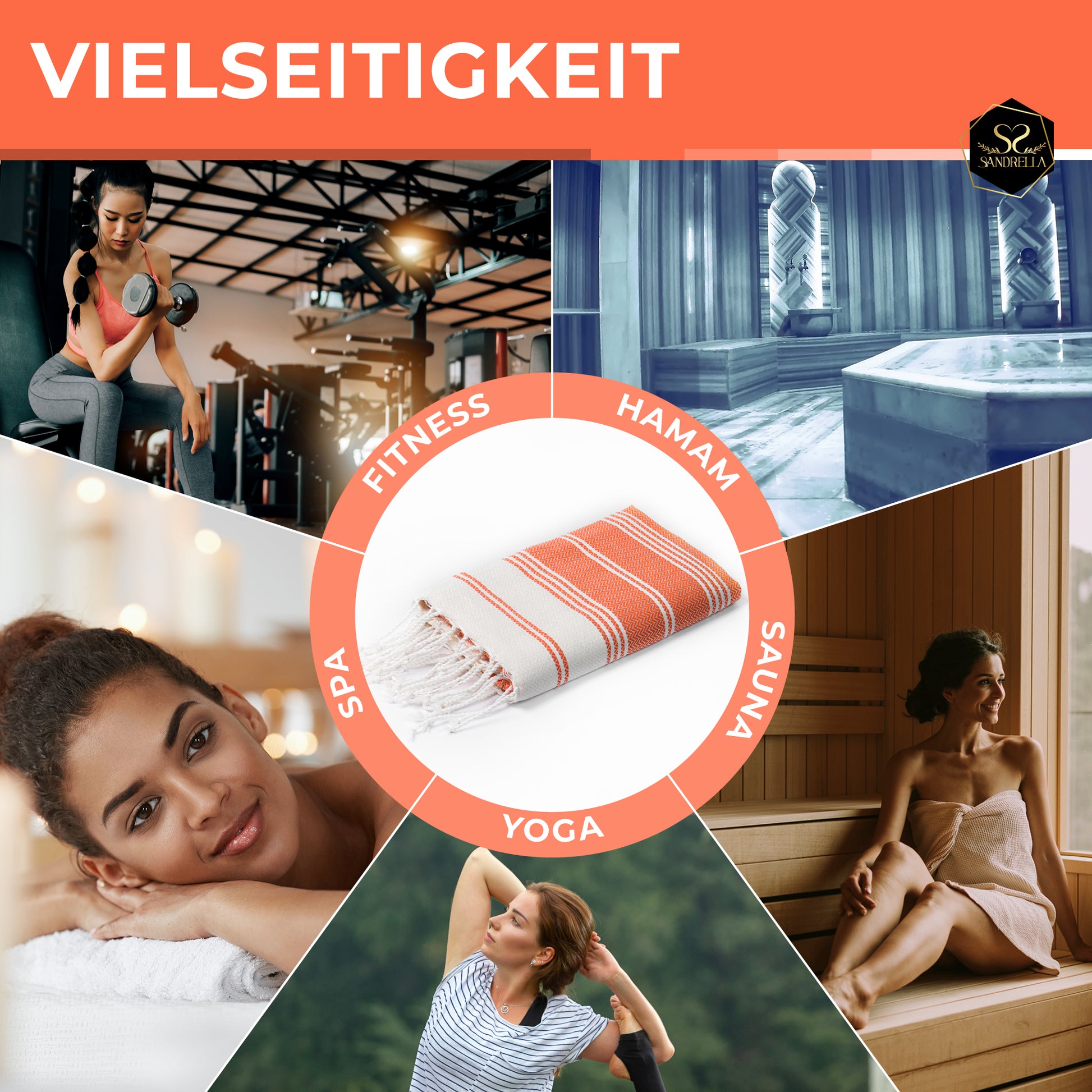 🏖️ VIELSEITIG - Unser Hamamtuch kannst du als Strandtuch, Duschtuch oder Yogatuch verwenden. Auch in der Sauna ist es der perfekte Begleiter. Durch die Vielseitigkeit sind unsere Hamamtücher ideal für Frauen oder Männer oder Paare die gerne in die Sauna, zum Strand oder Sport gehen.