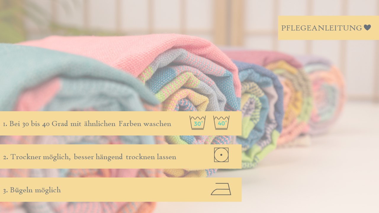 🧵 BAUMWOLLE – Das Hamamtuch wird mit Baumwolle hergestellt. Wir achten hierbei auf eine sehr hochwertige Qualität der Fasern. Die Baumwollfasern schaffen ein weiches Saunatuch, welches sich angenehm auf deiner Haut anfühlt.