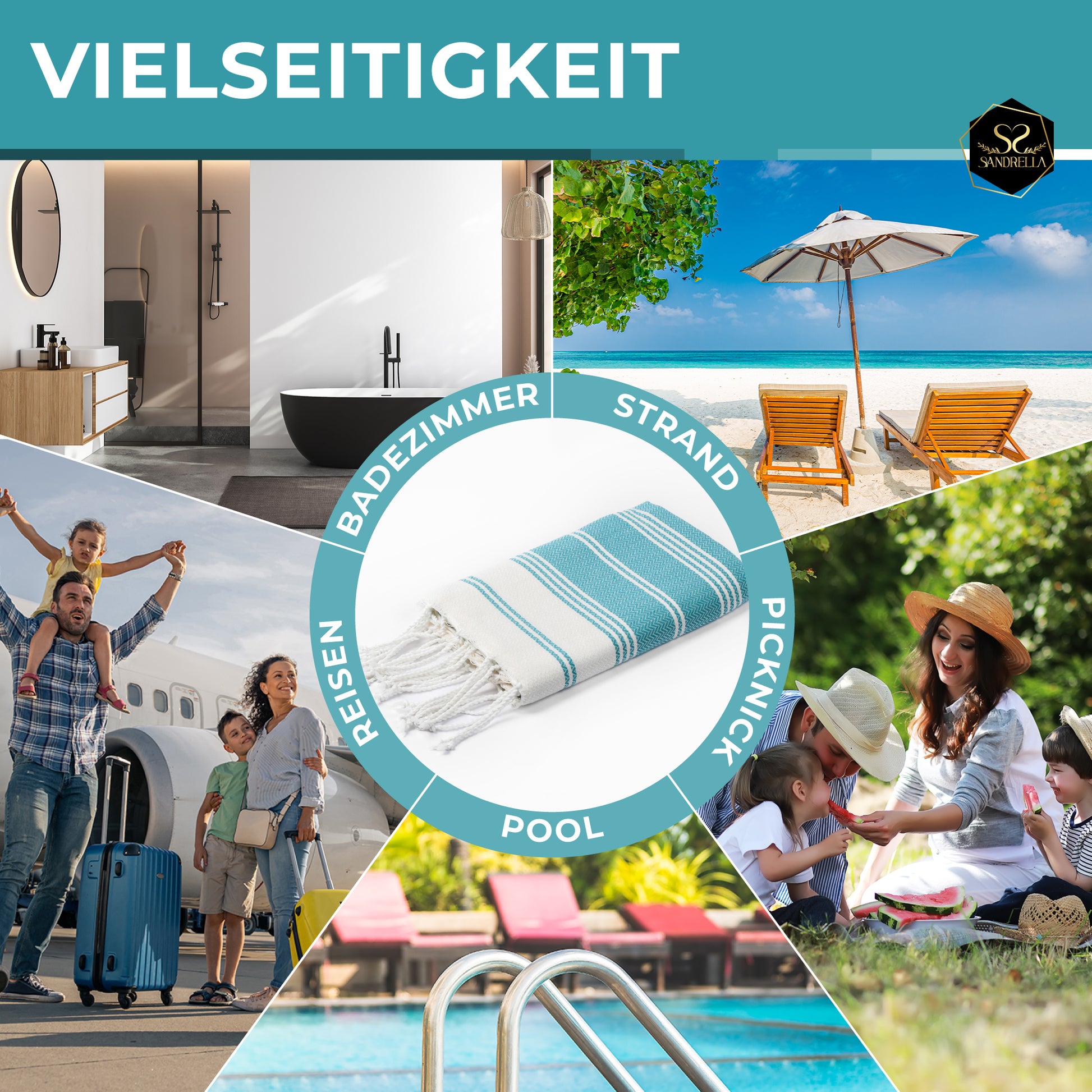 🧺 100 X 200 CM Du genießt dein Leben im Park, am Pool oder im Sand. Das große Hamamtuch mit den Abmessungen 100 x 200 cm eignet sich zur Mitnahme. Im Rucksack ist es klein und leicht, ausgepackt ist es ein großes Badetuch oder eine Picknickdecke.