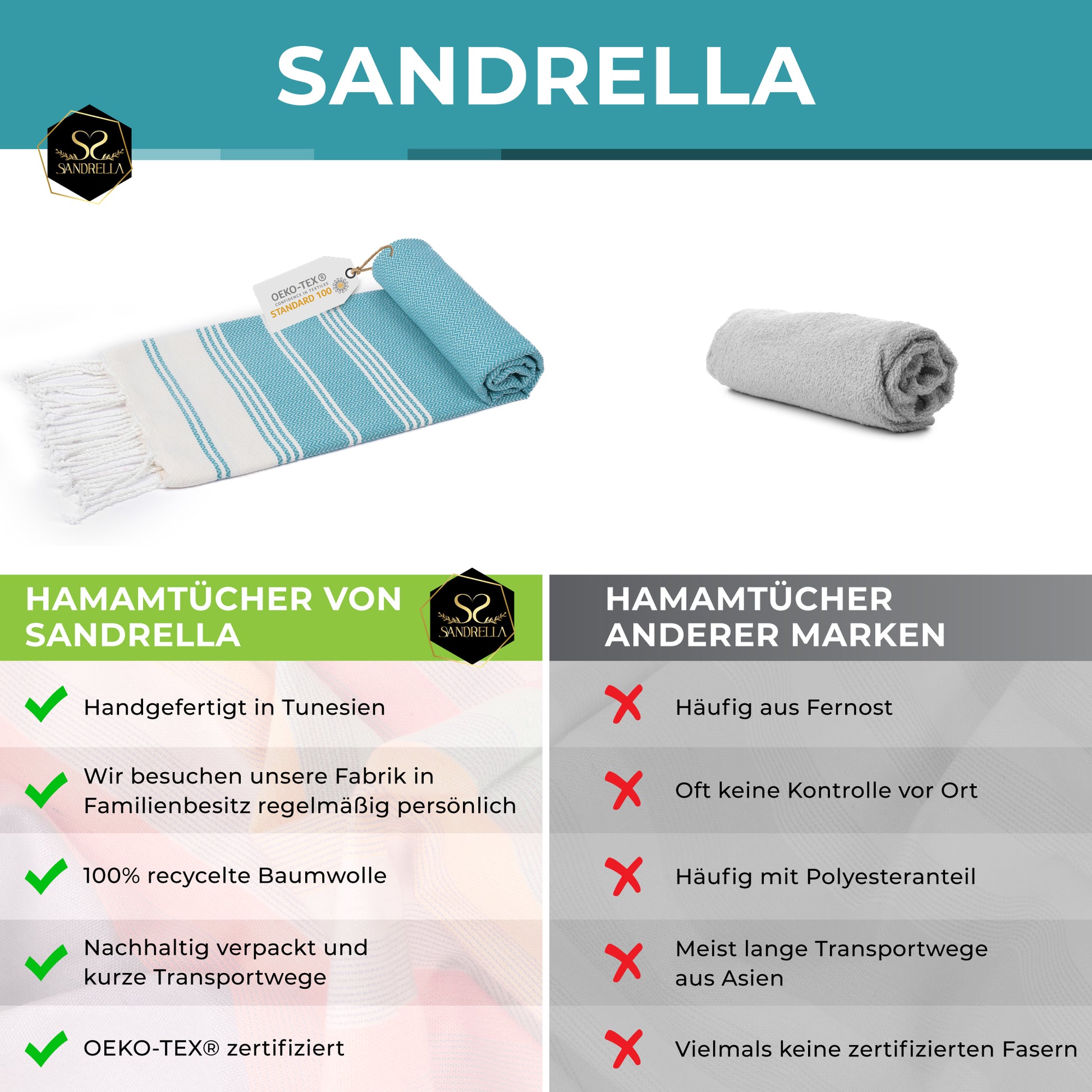 • „Hervorragende Qualität, extrem leicht und ein wunderschönes Design – und das zu einem unglaublich fairen Preis. Ich bin begeistert von den Hamamtüchern von Sandrella. Sie sind nicht nur ein elegantes Accessoire für Strandtage oder den Spa-Besuch, sondern lassen sich auch kompakt verstauen und sind der perfekte Begleiter auf jeder Reise.“