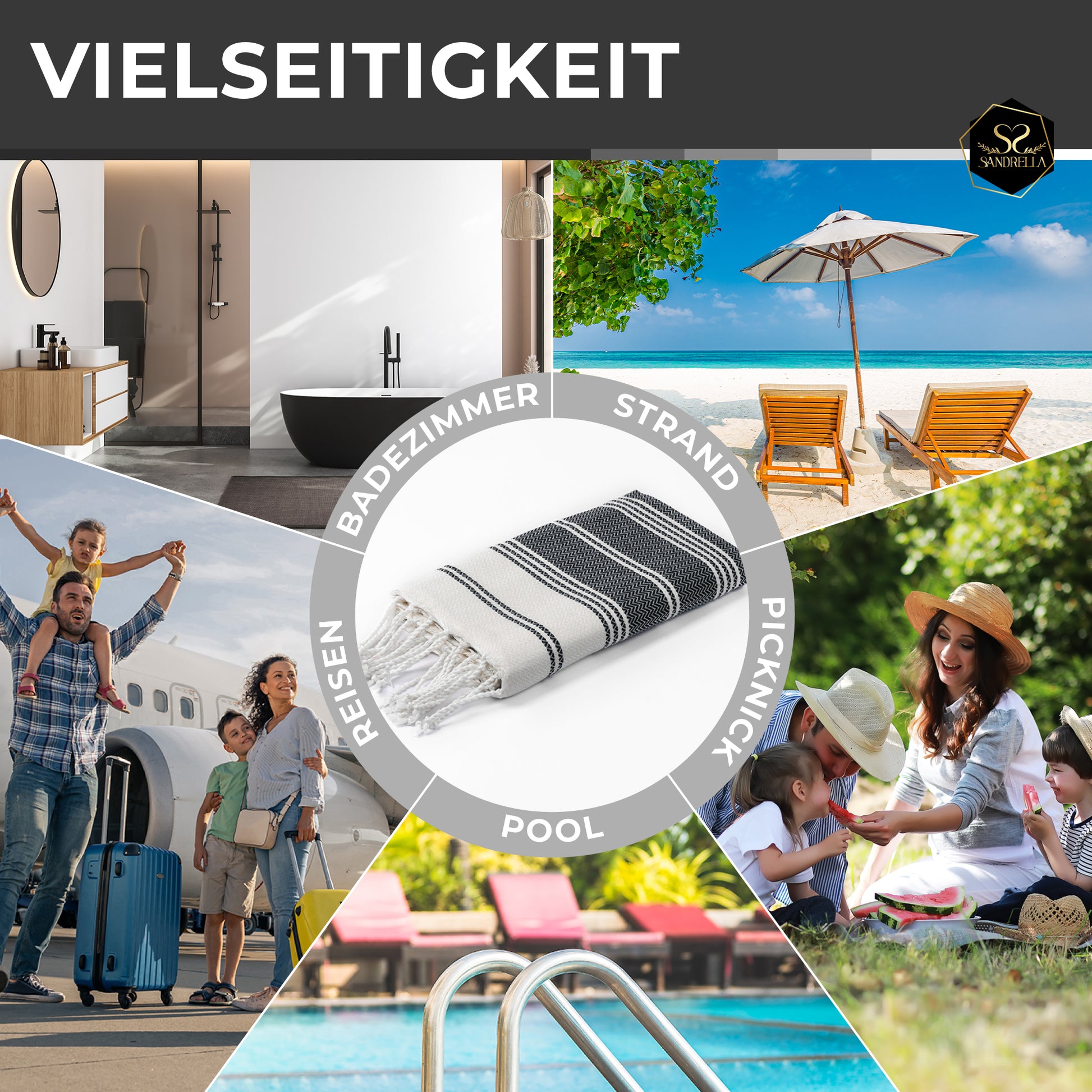 🧺 100 X 200 CM – Du genießt dein Leben im Park, am Pool oder im Sand. Das große Hamamtuch mit den Abmessungen 100 x 200 cm eignet sich zur Mitnahme. Im Rucksack ist es klein und leicht, ausgepackt ist es ein großes Badetuch oder eine Picknickdecke.