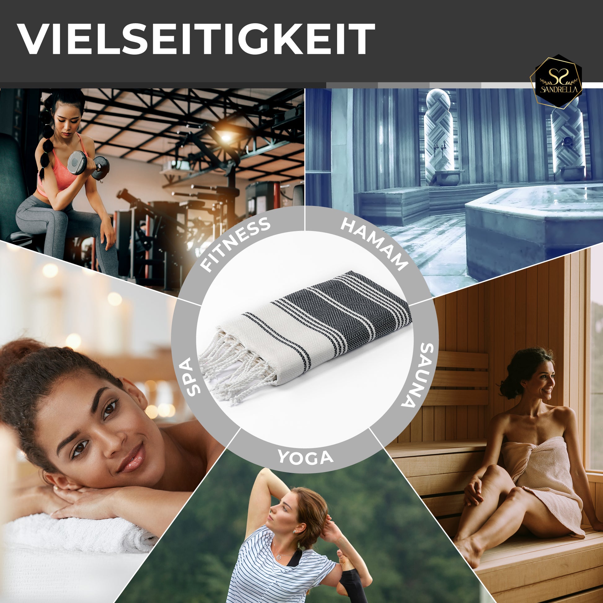 🏖️ VIELSEITIG - Unser Hamamtuch kannst du als Strandtuch, Duschtuch oder Yogatuch verwenden. Auch in der Sauna ist es der perfekte Begleiter. Durch die Vielseitigkeit sind unsere Hamamtücher ideal für Frauen oder Männer oder Paare die gerne in die Sauna, zum Strand oder Sport gehen.