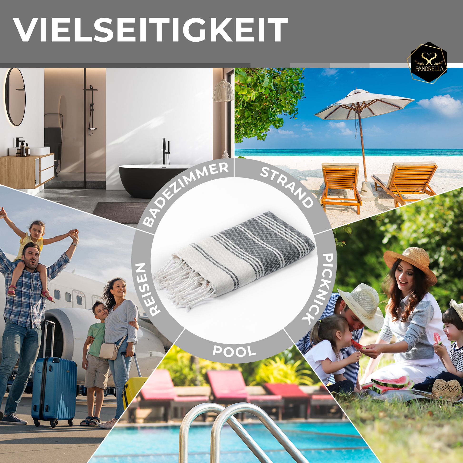 🧺 100 X 200 CM Du genießt dein Leben im Park, am Pool oder im Sand. Das große Hamamtuch mit den Abmessungen 100 x 200 cm eignet sich zur Mitnahme. Im Rucksack ist es klein und leicht, ausgepackt ist es ein großes Badetuch oder eine Picknickdecke.